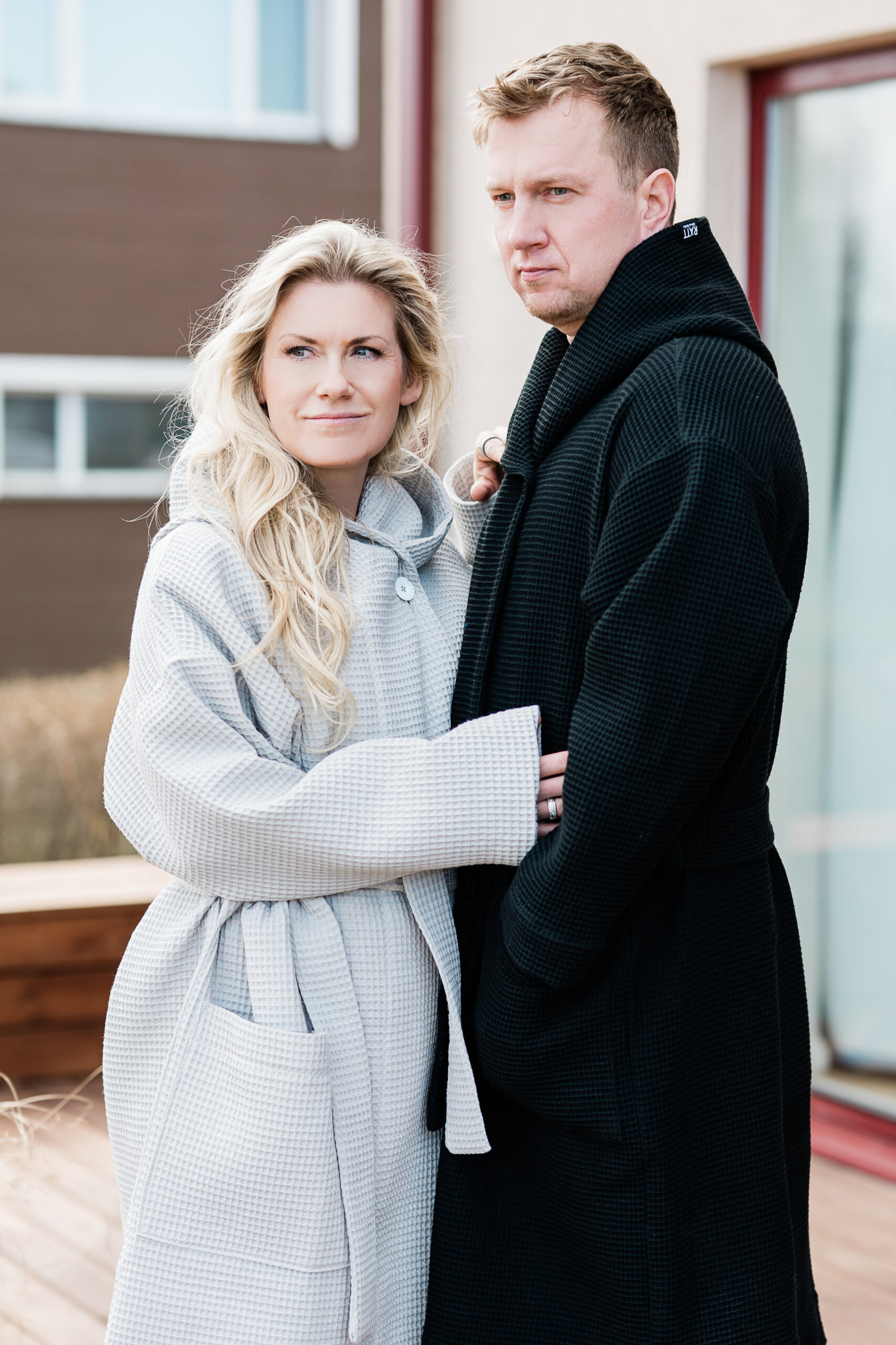 The coat is light and soft, absorbs moisture very well and dries quickly. A compact garment that fits both into a travel or beach bag.