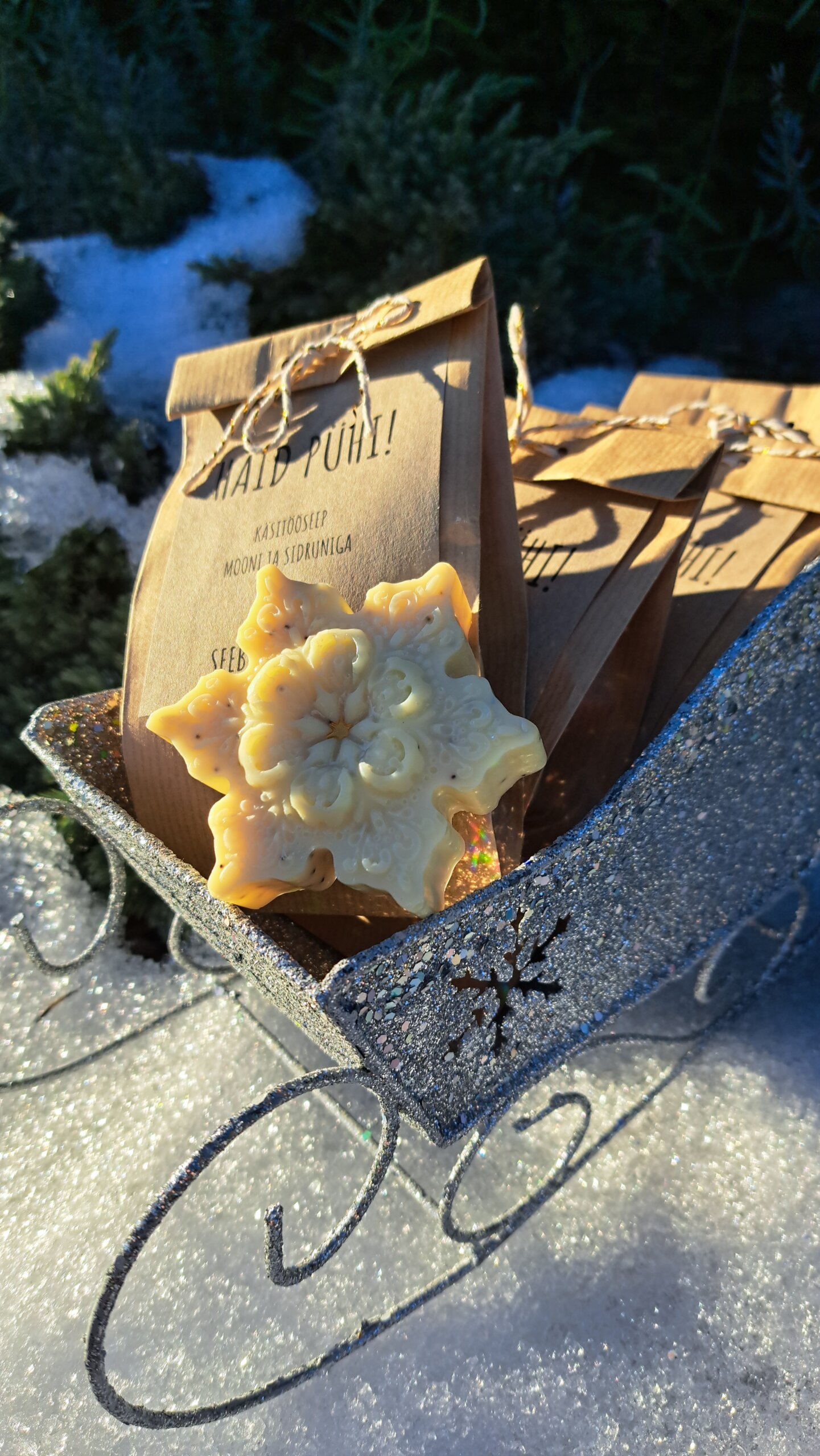 Kaal – käsitööseebi kaal muutub laagerdumise protsessi jooksul ja lõplik kaal sõltub säilitustingimuste õhuniiskusest. Meie jõuluse kujuga mooniseebid kaaluvad pakkimise hetkel u 60 grammi.
